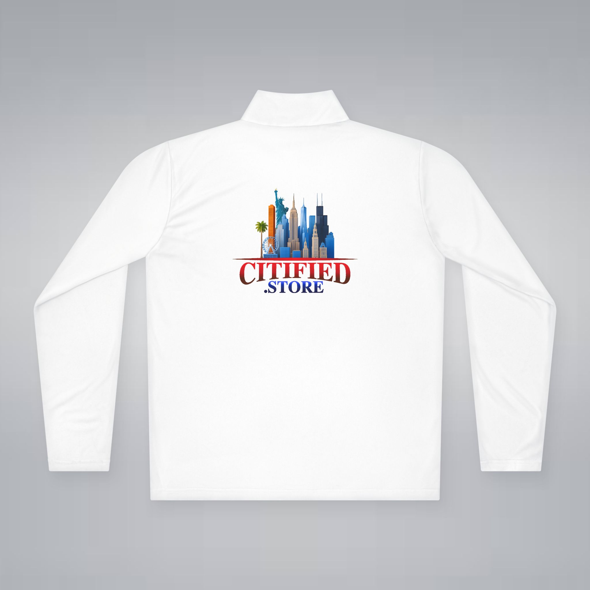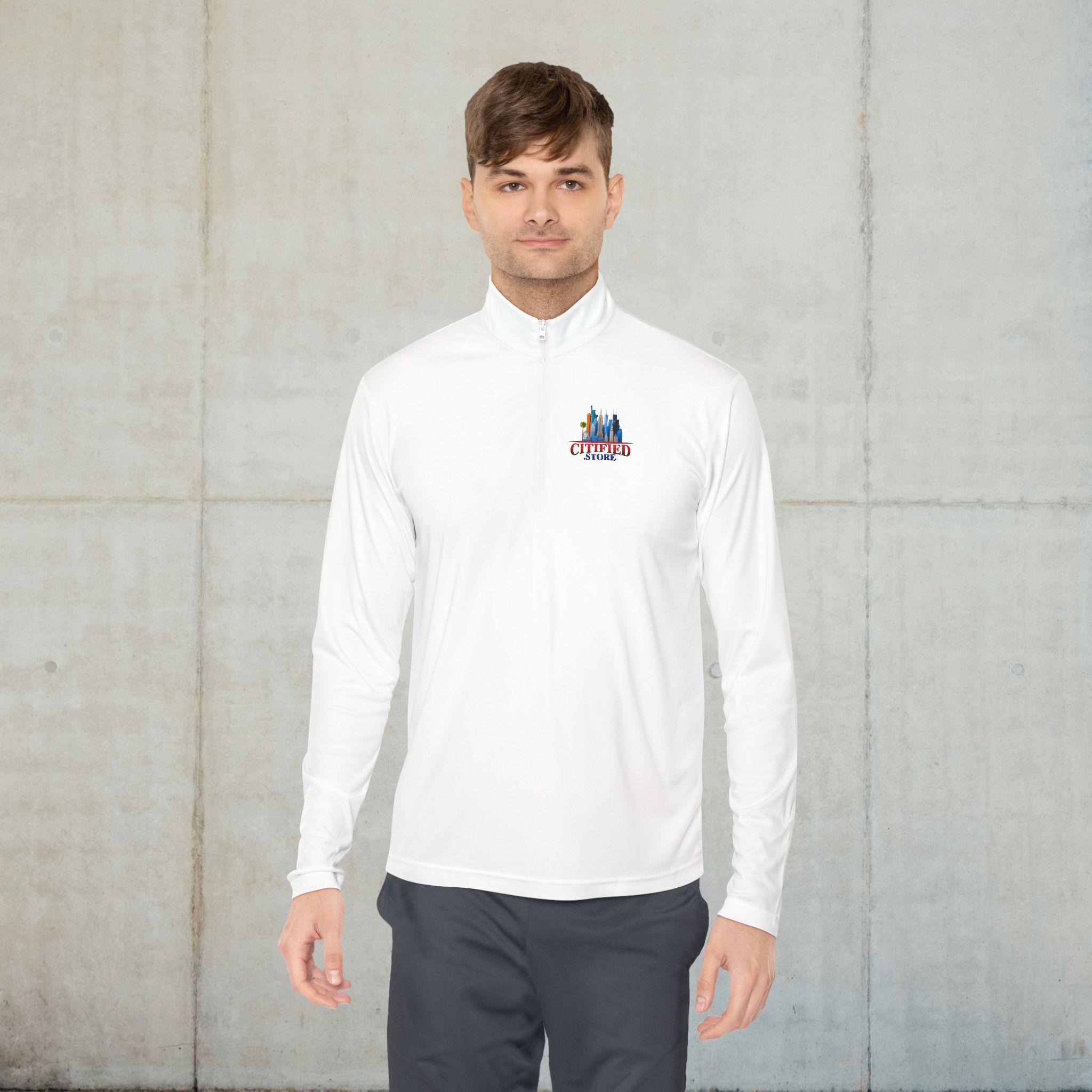 A lightweight quarter-zip pullover designed for active days in the city. The extra-light 100% polyester fabric moves moisture away so you stay cool while walking between meetings, running errands, or layering for cooler mornings. The cadet collar and reverse-coil zipper give a clean, athletic look that keeps the neck protected without bulk. A small, colorful skyline logo sits over the heart and a larger matching skyline print rests on the upper back — subtle branding that reads like a hometown emblem. Breathable, quick-drying, and easy to pack, this pullover blends performance with everyday style for anyone who spends their days on the go in urban environments.